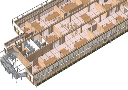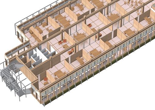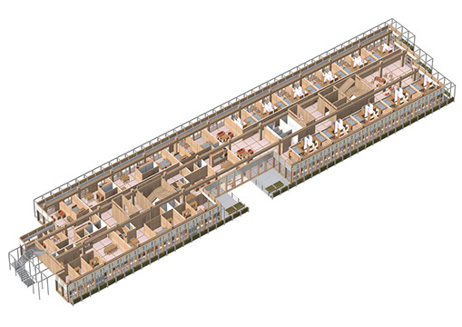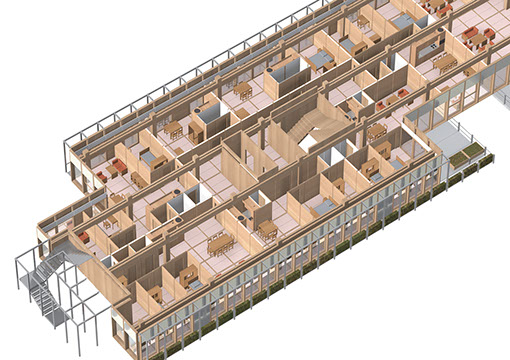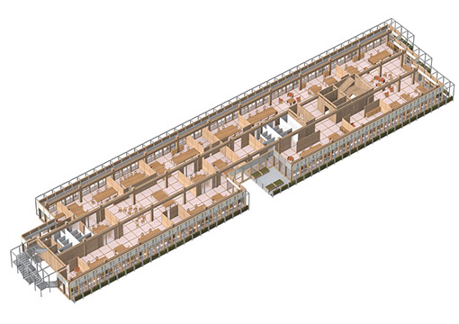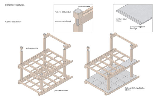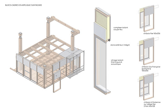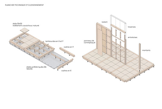 Un système constructif réversible et adaptable, dans une version inédite, outil idéal et nécessaire à ces transformations. Un jeu de construction sur la base d’assemblages d’éléments autonomes, à la nomenclature limitée, facilement montés et démontés. On pourra reconfigurer l’espace à tous les stades, au stade de conception, de construction, ainsi qu’au-delà.