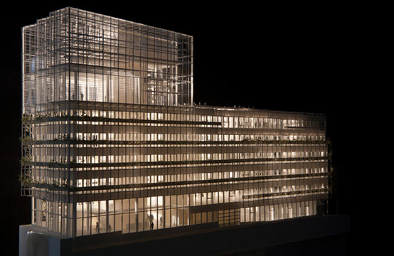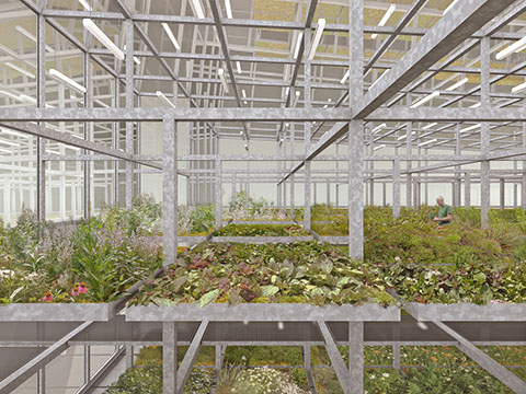 L’activité motrice de pépinière urbaine est ancrée dans un site propice par la proximité du parc Kellermann et l’appartenance plus générale à la ceinture verte. Nous prolongeons cette nature de plusieurs manières tout en répondant à de réelles nécessités économiques et écologiques. Les supports de culture ainsi que les éléments techniques et fonctionnels du bâtiment en constituent l’enveloppe. Les allées de bacs-jardins en toiture et terrasses, les coursives plantées et d’entretien des vitrages caractérisent le bâtiment qui s’affiche en usine horticole. La serre, située au sommet en est le signal le jour, et agira en lanterne hors format la nuit.
