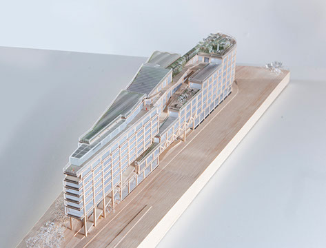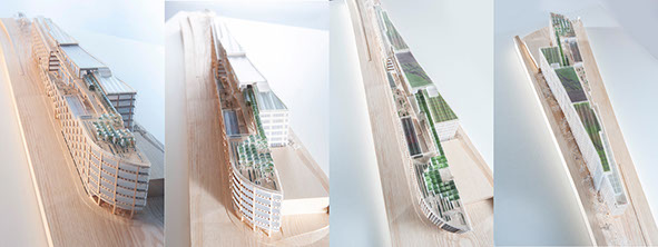 Depuis la médiane du terrain, entre le fleuve et les voies ferrées, une rampe en ciseaux se déploie et s’ouvre sur la Seine ; elle offre une multiplicité d’appréhensions de la ville et génère une succession de terrasses qui constituent la base d’exploitation et de recherche à la disposition de la programmation interne. Elle trace également la limite entre les espaces résidentiels situés dans la partie étroite du bâtiment et les espaces de travail dans sa partie la plus large .