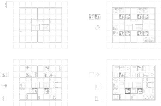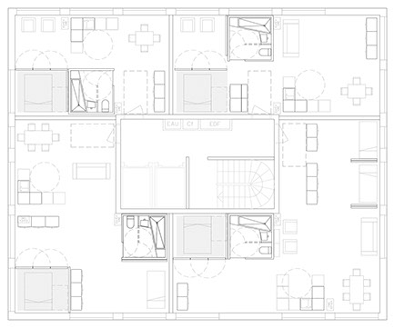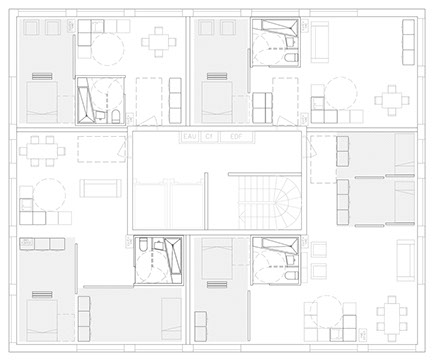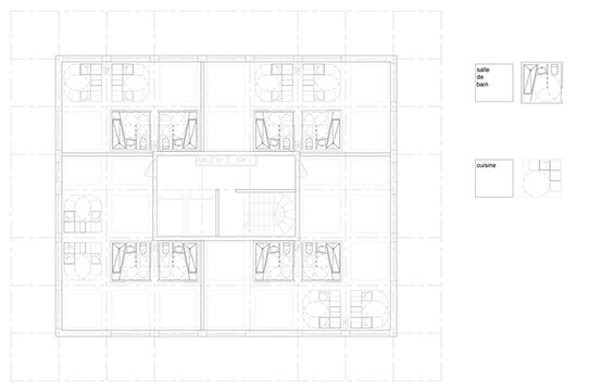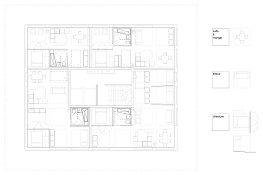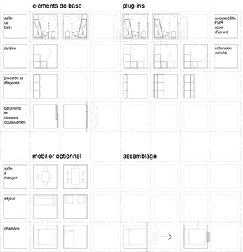project developed as part of the contest Adivbois on the site of St-Herblain, proposes an interior layout of 48 dwellings, reversible at three time scales.