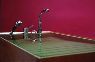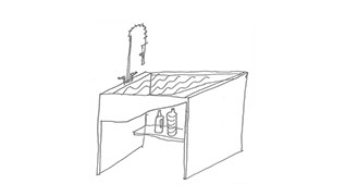 design of a furniture that can be moved around and serves different domestic uses: shower, sink, cooking, rack