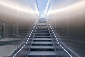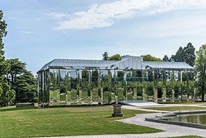 Rebuilt after the last war in a style refl ecting the local Ile de France architecture, though on a much smaller scale than the original, the Château de Rentilly lost its historical value and its significant relationship with its remarkable location. This project has sought to restore both aspects by encasing the building in a second skin of pleated, mirror polished stainless steel which reflects and diffracts the image of the park, acting as a kind of sound box. The interior has been stripped down and simultaneously opened up on both opposite sides, one to the jardin à la française, the other to the english landscape park, emphasising the concept of immersion in the natural world.