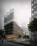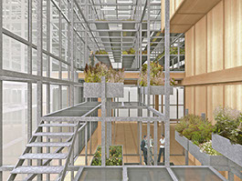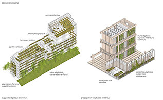 L’activité motrice de pépinière urbaine est ancrée dans un site propice par la proximité du parc Kellermann et l’appartenance plus générale à la ceinture verte. Nous prolongeons cette nature de plusieurs manières tout en répondant à de réelles nécessités économiques et écologiques. Les supports de culture ainsi que les éléments techniques et fonctionnels du bâtiment en constituent l’enveloppe. Les allées de bacs-jardins en toiture et terrasses, les coursives plantées et d’entretien des vitrages caractérisent le bâtiment qui s’affiche en usine horticole. La serre, située au sommet en est le signal le jour, et agira en lanterne hors format la nuit.