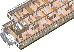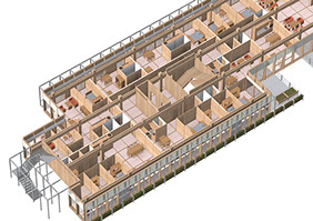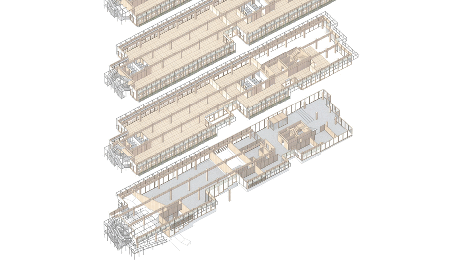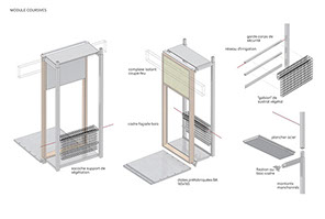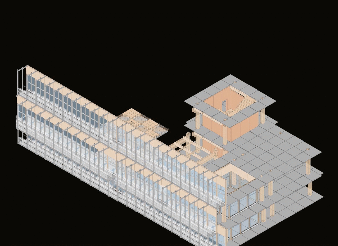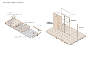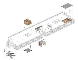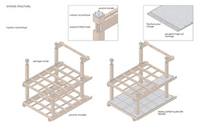 Un système constructif réversible et adaptable, dans une version inédite, outil idéal et nécessaire à ces transformations. Un jeu de construction sur la base d’assemblages d’éléments autonomes, à la nomenclature limitée, facilement montés et démontés. On pourra reconfigurer l’espace à tous les stades, au stade de conception, de construction, ainsi qu’au-delà.