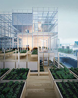 The idea of proposing an urban plant nursery is anchored in the favorable location of the site, close to the Kellermann Park and generally an effort to make it part of the wider green zone. We extend this notion in several ways while responding to real economic and ecological needs. The cultivation media as well as the technical and functional elements of the building constitute its shell. The paths of garden tubs on the roof and terraces, the passageways planted and the glazing, all characterize the building, which appears as a horticultural factory. The greenhouse, on the rooftop is envisioned to act as a light-sign during nighttime.