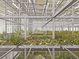 The project was conceptualised from the changing nature of the context given by its position at the edge of an evolving ring road and by its program, which would bring together research laboratories and new businesses within a horticultural operation that require spaces of variable geometry.