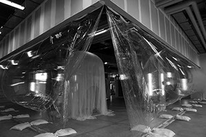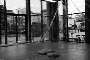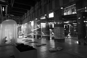 Invités par le Centre National Edition Art Image à participer à l’exposition réalisée sur Alison Knowles autour du poème A House Of Dust et par les Magasins généraux à réaliser une paroi séparatrice entre l’espace d’exposition et le hall, nous proposons de réaliser un projet unique qui à la fois protège les œuvres et prenne corps avec elles, en rendant compte de la dimension auto-générative et fluctuante du poème. Un blister géant, sorte de rideau transparent gonflable, dont la géométrie varie au rythme d’une programmation lente, pendant le temps d’ouverture de l’exposition et retombe pendant sa fermeture.