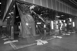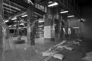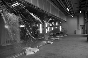 Invited by CNEAI to participate in the exhibition on Alison Knowles around the poem A House of Dust and by the Magasins généraux to create a dividing wall between the exhibition space and the entrance hall. Our proposal was to create a unique project that both protects the artwork and is shaped along with them, by reflecting the self-generative and fluctuating dimension of the poem. A giant blister pack, a sort of transparent inflatable curtain, the geometry of which varies at the rate of slow programming, while the exhibition is open and falls when it is closed.