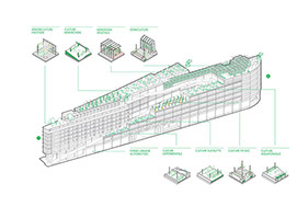 Depuis la médiane du terrain, entre le fleuve et les voies ferrées, une rampe en ciseaux se déploie et s’ouvre sur la Seine ; elle offre une multiplicité d’appréhensions de la ville et génère une succession de terrasses qui constituent la base d’exploitation et de recherche à la disposition de la programmation interne. Elle trace également la limite entre les espaces résidentiels situés dans la partie étroite du bâtiment et les espaces de travail dans sa partie la plus large .