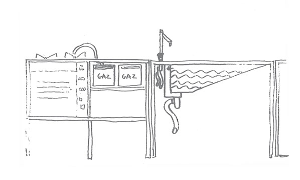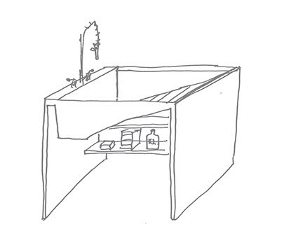 design of a furniture that can be moved around and serves different domestic uses: shower, sink, cooking, rack