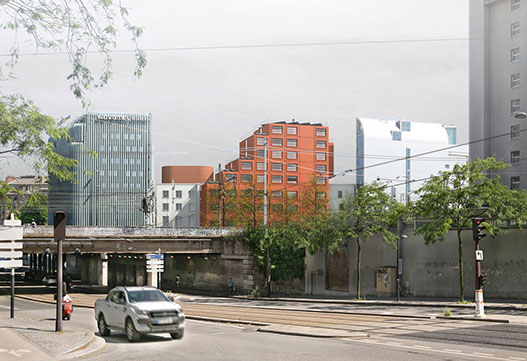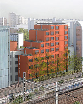 All of these reasons diverted the development of the project towards an alternative and unexpected solution that of an autonomous structure, which completed the site and put itself at the service of the program. The building that turns around itself and is exposed to the train tracks, rises to the height of its neighbouring buildings and adds to the collection of objects posed in the loose and motley urban fabric of the Parisian zone.