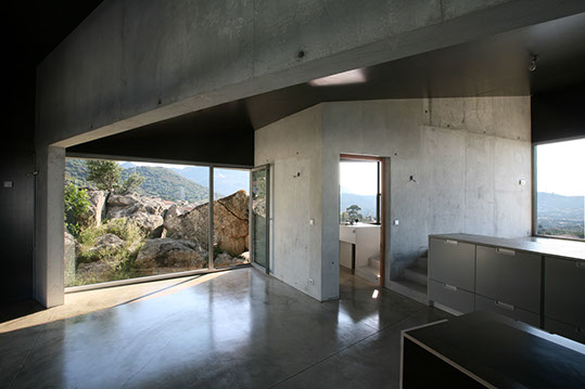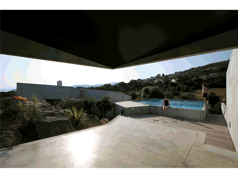 Ce parti d’investir les points culminants et rocheux renvoie aux villages ancestraux corses et à des pratiques encore plus anciennes (occupations néolithiques) – la construction a d’ailleurs été diff érée par des fouilles archéologiques sur le site. Il ne s’agit cependant plus d’anticiper les dangers et les invasions mais de se sentir à la fois protégé et projeté dans le paysage lointain.