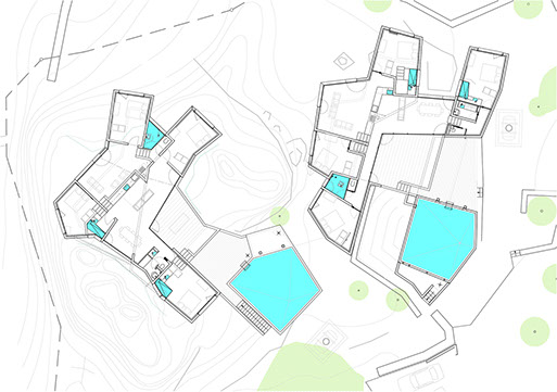 Les trois lignes qui correspondent à chacun des éléments s’enroulent librement au gré du relief, des orientations et des obstacles naturels, ne coïncidant pas systématiquement. Cette complexité entraîne des développés et des prouesses techniques supérieurs à ceux d’une maison traditionnelle et impose une sobriété quant au choix des matériaux et des prestations, en accord avec la rudesse du site. La notion de luxe est ainsi déplacée.