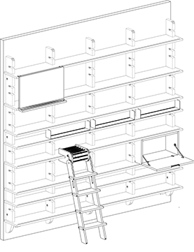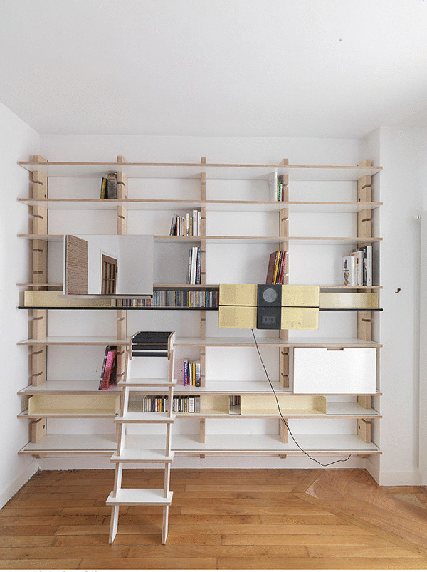 wall book and media shelves with sliding accessories for the photographer Florian Kleinefenn