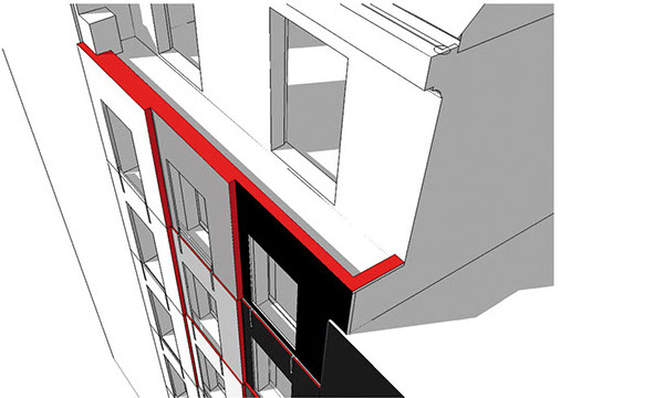 Chaque élément fonctionnel est traité de telle sorte qu’il en magnifie l’usage et en premier lieu, l’isolation extérieure qui offre l’opportunité de réaliser un nouveau parement en applique et d’opérer une transformation radicale de la façade tout en s’inscrivant dans l’histoire du quartier.