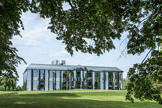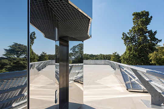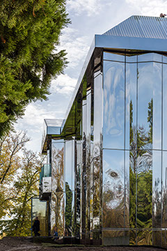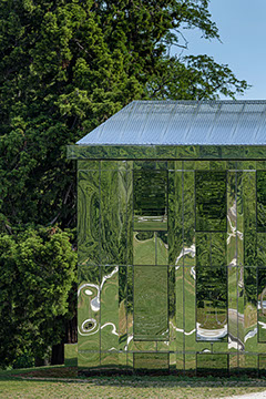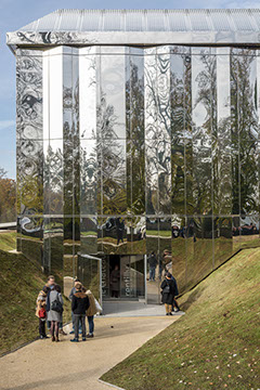 Rebuilt after the last war in a style refl ecting the local Ile de France architecture, though on a much smaller scale than the original, the Château de Rentilly lost its historical value and its significant relationship with its remarkable location. This project has sought to restore both aspects by encasing the building in a second skin of pleated, mirror polished stainless steel which reflects and diffracts the image of the park, acting as a kind of sound box. The interior has been stripped down and simultaneously opened up on both opposite sides, one to the jardin à la française, the other to the english landscape park, emphasising the concept of immersion in the natural world.