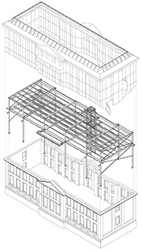 Reconstruit après la dernière guerre mondiale, dans un style Ile de France, à une échelle bien moindre que l’édifice d’origine, le château de Rentilly a perdu sa valeur historique et sa prestance au centre d’un site remarquable. Le projet consiste à le renforcer en l’habillant d’une peau plissée d’inox poli miroir qui refl ète et difracte l’image du parc dont il devient la caisse de résonnance L’évidement intérieur du bâtiment et son ouverture simultanée sur les deux faces du jardin renforce cette idée d’immersion dans la nature.
