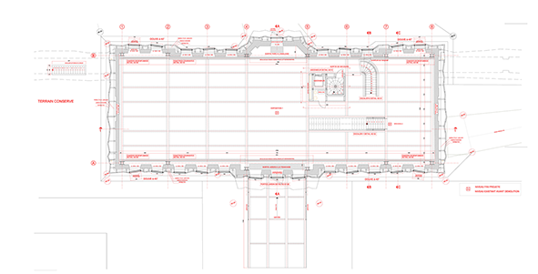 L’accès au centre d’art se fait par le sous-sol du XVIème, seul vestige historique du château, qui intègre toutes les fonctions annexes du musée, avant d’émerger sur les deux plateaux voués exclusivement à l’exposition. Dernière intervention, la transformation de la toiture en terrasse, troisième plateau d’exposition extérieur mais aussi belvédère sur le parc, les étangs avoisinnants et le paysage lointain.