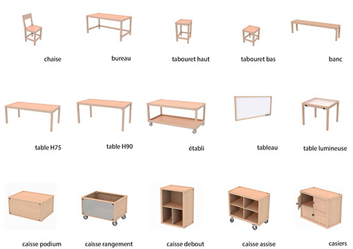 The third element which guided the development of the project was to give it an educational dimension by proposing that the furniture could be assembled and dismantled by the students themselves. We had in mind to continue our research into the development of reversible assemblies requiring neither glue, nor tools, nor hardware to facilitate the appropriation of furniture, reduce manufacturing costs and why not offer students a first lesson in design. The teaching staff were involved from the beginning of the project and particularly in taking consideration into the needs and uses, and welcomed the idea with great enthusiasm.