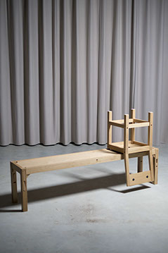 La volonté dans le contexte de Nancy, berceau du design au XXème siècle, qui plus est dans le cadre d’une école d’art et de design, est de ne pas interférer avec leur production, d’où le choix de partir d’un modèle archaïque comme base de déclinaison. L’objet qui va servir de modèle au développement de l’ensemble est une chaise d’église rurale du début du XXème siècle que nous trouvons parfaite pour ses proportions et sa simplicité. Cette chaise est un héritage familial et les cinq exemplaires que nous possédons font partie de notre quotidien. Nous avions en tête d’en proposer une réplique depuis bien longtemps mais l’opportunité ne s’était jamais présentée de manière aussi évidente.