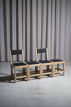 The desire in the context of Nancy, cradle of design in the twentieth century, within the framework of an art and design school, was not to interfere with their art and design production; hence, the choice to start from archaic model of furniture was the basis for declination. The object that used to serve as a model for the development of the ensemble was a typical rural church chair from the beginning of the 20th century that we find perfect for its proportions and simplicity. This very chair was a family heirloom and the five copies we own are part of our daily life. We always wished to come up with a replica for a long time, but the opportunity had never presented itself so obviously.