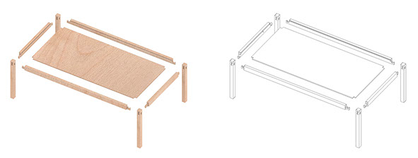 Le troisième élément qui guide le développement du projet est de lui donner une dimension pédagogique en proposant que le mobilier puisse être monté et démonté par les étudiants eux-mêmes. Nous avions en tête de poursuivre nos recherches dans l’élaboration d’assemblages réversibles ne nécessitant ni colle, ni outillage, ni quincaillerie pour faciliter l’appropriation des meubles, réduire les coûts de fabrication et pourquoi pas proposer aux étudiants une première leçon de design ou plutôt d’ébénisterie. Le corps enseignant, impliqué dès son origine dans l’élaboration du projet et particulièrement dans l’énoncé des besoins et des usages, accueille l’idée avec enthousiasme.