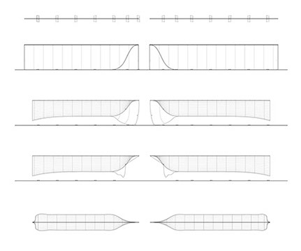 Invited by CNEAI to participate in the exhibition on Alison Knowles around the poem A House of Dust and by the Magasins généraux to create a dividing wall between the exhibition space and the entrance hall. Our proposal was to create a unique project that both protects the artwork and is shaped along with them, by reflecting the self-generative and fluctuating dimension of the poem. A giant blister pack, a sort of transparent inflatable curtain, the geometry of which varies at the rate of slow programming, while the exhibition is open and falls when it is closed.