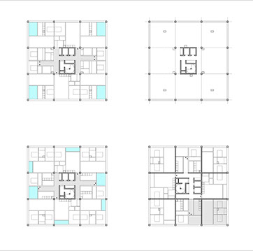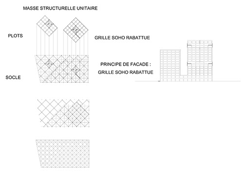 At this stage, our will is to present the potentiality rather than an architectural project, a set of possibilities and explorations, the choice of which will be made after discussions with the project stakeholders. Beyond the design phase, we plan to extend this structural and organizational flexibility over several time scales. At the assignment phase, it is important the distribution and equipment of housing in agreement with the identified buyers, especially those of HAB 'X. During the intervention, the optional connection between business premises and SOHO housing is emphasised while in a more distant projection, the event of a change in the final use of the building is has been taken into consideration.