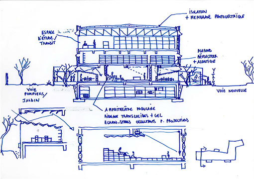 The installation of CNAP in Pantin represents a series of challenges and opportunities for the institution, its function, its accessibility, the comfort of its staff. In addition, because of the character of the Pantinese territory and more broadly the northeast region of Paris, a sector in transformation, to which the CNAP will contribute through its influence and its participation in the matrix of public and institutional polarities.